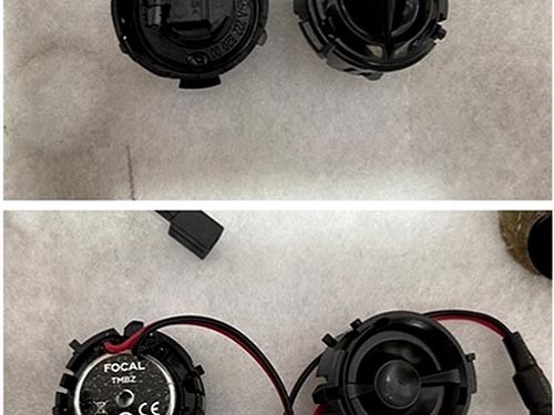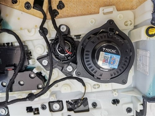 接下來開始安裝喇叭,前聲場選用法國勁浪奔馳專用中高音+亞麻中低音喇叭,后聲場選用法國勁浪奔馳專用中高音喇叭。這套喇叭性能穩(wěn)定,高音通透亮麗,中音自然輕柔,中低音飽滿細(xì)膩。