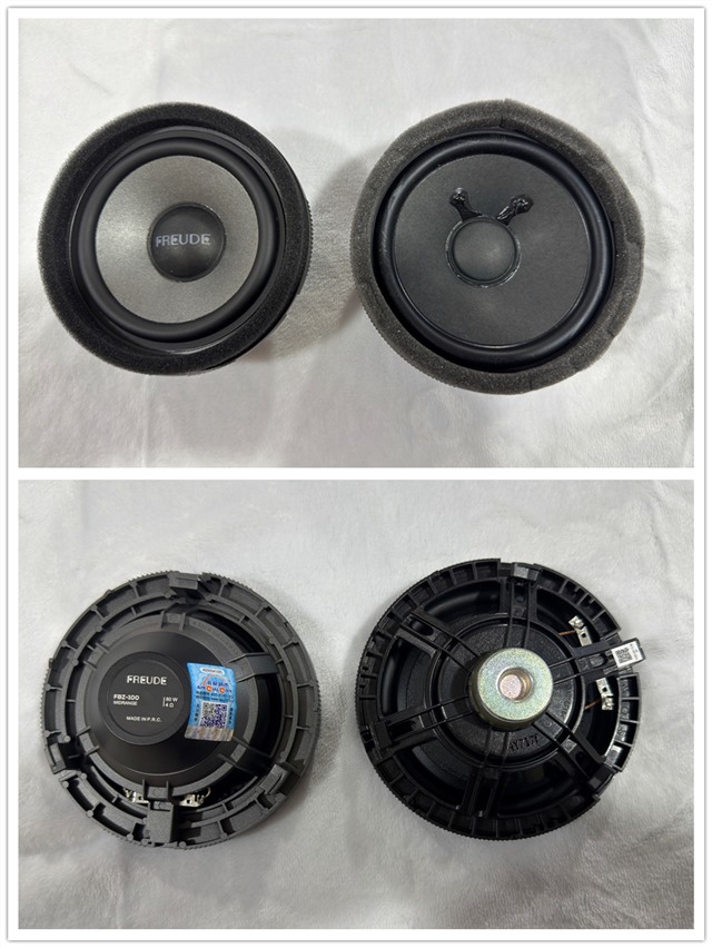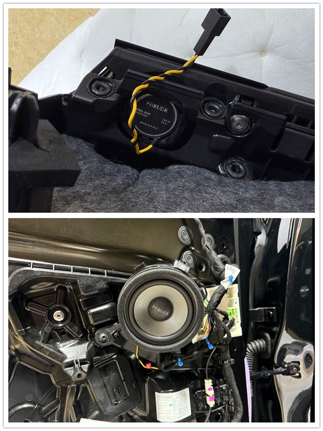 前門板部分,安裝了一套弗萊德FBZ-100兩分頻系統(tǒng)。在前門三角窗位置新增了兩個FBZ-100高音喇叭,提升高頻表現(xiàn)。原車中音喇叭被無損替換為FBZ-100中音喇叭,確保聲音的飽滿度。高音的加入使得音樂的層次感和細(xì)節(jié)顯著提升,中音喇叭的音質(zhì)也變得更加清晰、圓潤。后門板的兩個中音喇叭則換裝為弗萊德FBZ-100C中音喇叭,顯著提升了中音的細(xì)節(jié)表現(xiàn)。