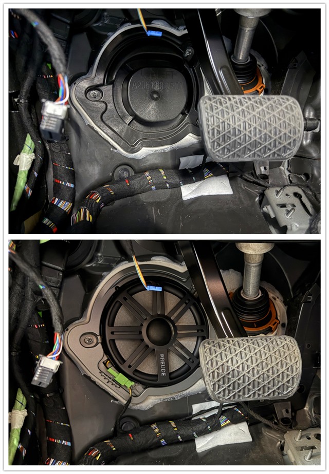 腳踏板部分,右側(cè)原有的中低音喇叭被替換為FBZ-SUB中低音喇叭,同時在左側(cè)腳踏板新增一個FBZ-SUB中低音喇叭,補(bǔ)齊了原車的設(shè)計不足。低音的加強(qiáng)讓音樂有了更好的節(jié)奏感和沖擊力