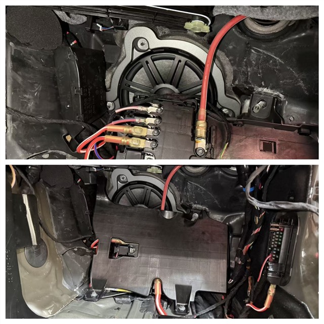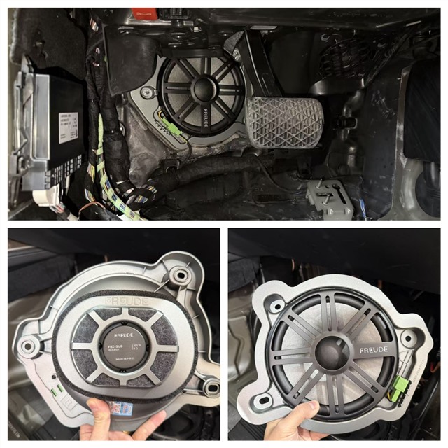 弗萊德FBZ-SUB低音喇叭的表現(xiàn)更是讓人眼前一亮。這款喇叭用料扎實,質(zhì)感高檔,拿在手中分量十足。其尺寸與奔馳E300的原車低音安裝位完美吻合,無需對車身進行任何切割、打孔,直接實現(xiàn)原位安裝。技師將副駕駛位置的原車低音替換為弗萊德FBZ-SUB低音喇叭。