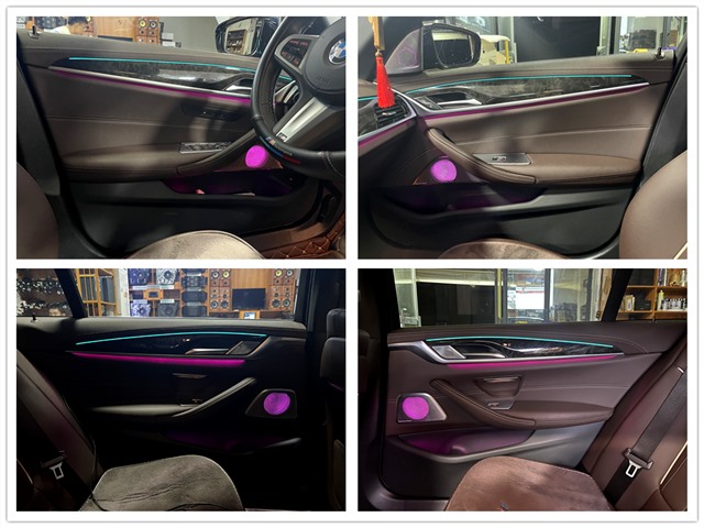 勁浪IS BMW 100L中低音喇叭原位安裝在前門板并加裝發(fā)光蓋板增加汽車內(nèi)飾整體美觀度