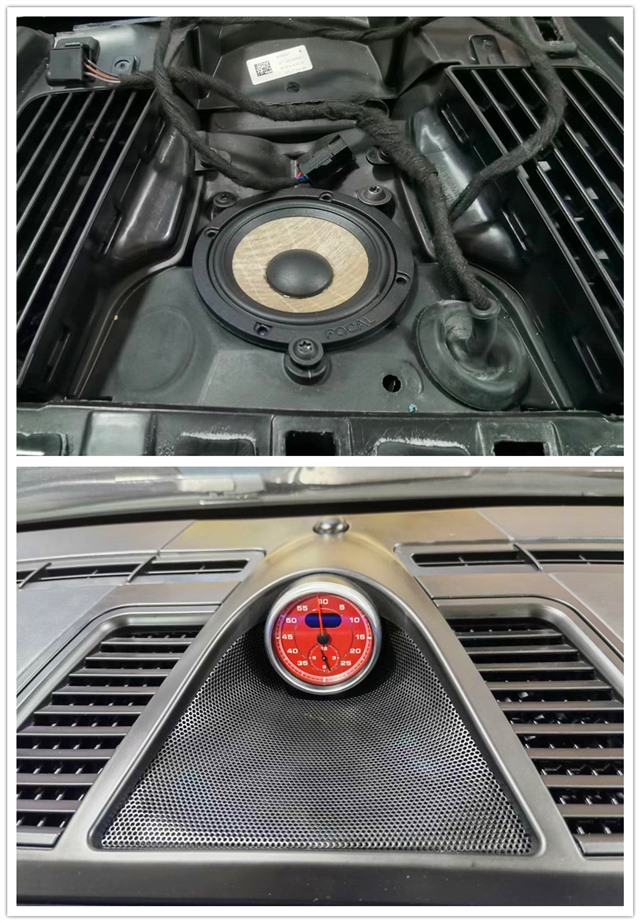 接下來(lái),我們著手升級(jí)前聲場(chǎng)。針對(duì)保時(shí)捷車型,我們選擇了勁浪ISMBZ 100 兩分頻+一對(duì)勁浪 ISUB BMW4 低音,其高品質(zhì)音色和精湛工藝,為前聲場(chǎng)提供了清晰、細(xì)膩、飽滿的聲音。中置位再加上3.5寸的勁浪亞麻中音協(xié)調(diào)配合,讓車主感受到音樂(lè)的真實(shí)和動(dòng)感。