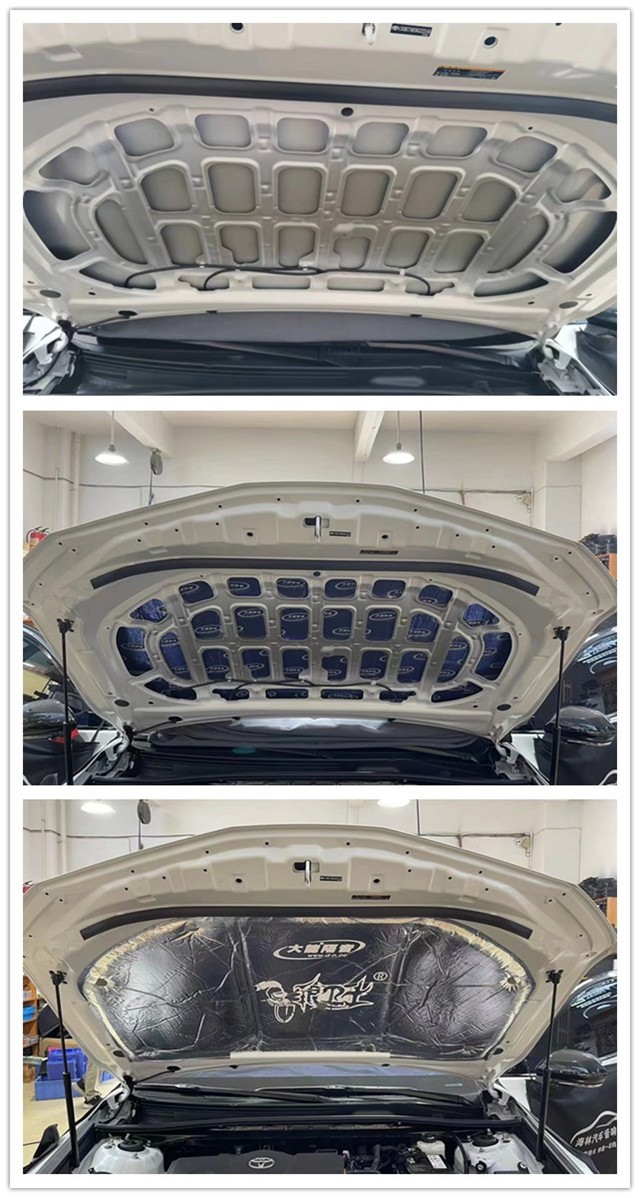 我們的汽車引擎蓋是離發(fā)動(dòng)機(jī)的距離最近的,發(fā)動(dòng)機(jī)工作時(shí)就會(huì)不斷引起周邊金屬的振動(dòng),然后將噪音進(jìn)行傳遞,熱量的產(chǎn)生也會(huì)對引擎蓋進(jìn)行烘烤,導(dǎo)致漆面老舊,影響漆面的美觀。所以改裝師使用大能藍(lán)金剛做第一層止振的基礎(chǔ),再貼上銀衛(wèi)士作為第二層,有了銀衛(wèi)士的加入,讓隔音隔熱產(chǎn)生立竿見影的效果。