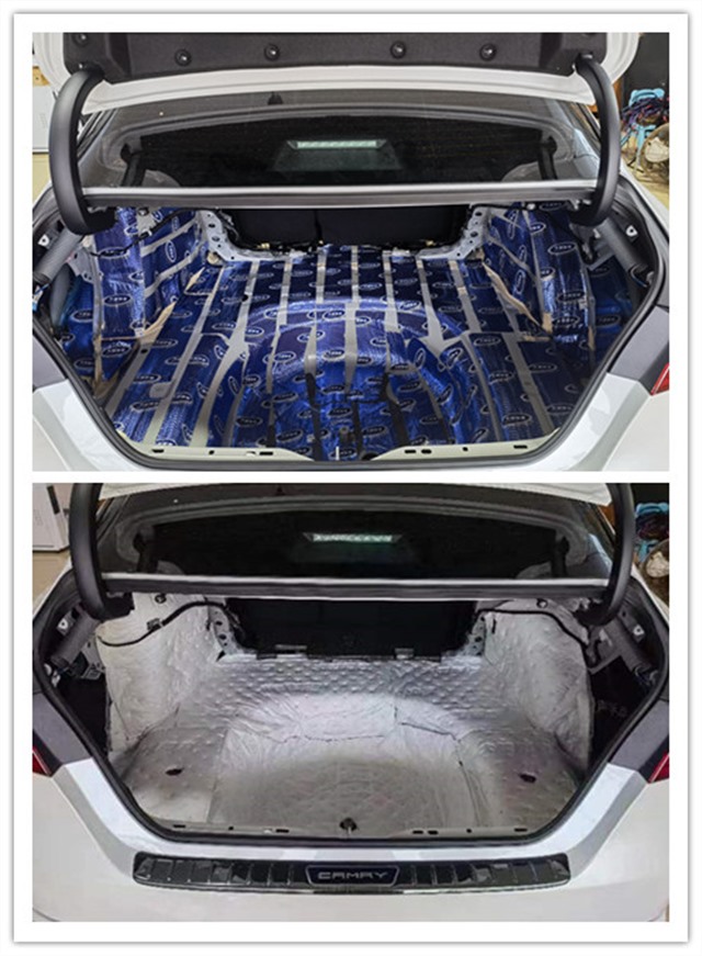 由于尾箱是后輪轂噪音和排氣噪音的主要通道,通過尾箱會(huì)傳入大量的噪音及燥熱。而豐田凱美瑞的原車尾箱沒有任何的隔音處理,薄弱的鈑金更容易將噪音傳遞到駕駛室,長時(shí)間的震動(dòng)也會(huì)導(dǎo)致尾箱的鈑金強(qiáng)度下降,所以使用大能藍(lán)金剛進(jìn)行第一層止震處理,將材料均勻地粘貼在鈑金表面,增加鈑金厚度,抑制鈑金振動(dòng),最后使用超級溫莎,吸收尾箱及輪轂部分的各類高頻噪音。