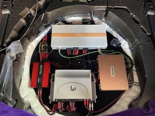 歌航G2pro主機(jī)、電容以及三臺(tái)功放一同接線隱藏安裝在備胎凹槽位置。從圖中可以看到走線整齊,既美觀又不占用尾箱空間