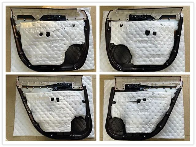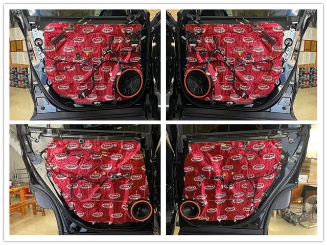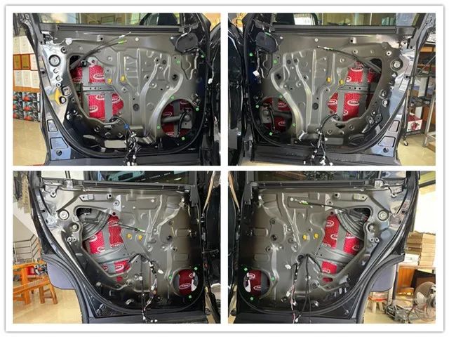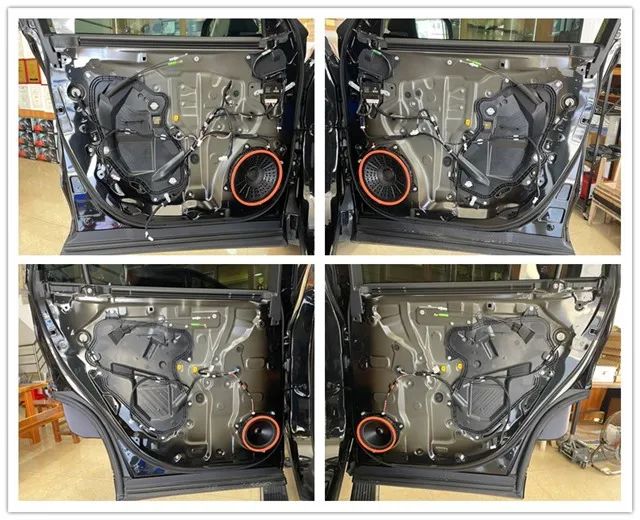 隨后,改裝師拆開門板看到其內(nèi)部結(jié)構(gòu)空洞,鋼板較薄,容易引起共振;利用大能紅派、超級(jí)溫莎對(duì)門板進(jìn)行三層隔音處理,不僅能抑制車門薄弱鋼板的震動(dòng),降低傳入車艙的風(fēng)噪,還可以增加門板的剛性與密封性。從而使車門更加適合成為揚(yáng)聲器的箱體,以確保聲音更加清晰通透。