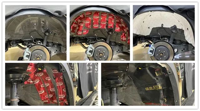 輪胎與地面摩擦?xí)a(chǎn)生很大的胎噪,此類噪聲主要通過輪弧傳入到車廂內(nèi)部。使用大能隔音材料對(duì)輪弧做精密隔音處理,相當(dāng)于切斷胎噪的傳播途徑,有效減少胎噪傳入車廂。