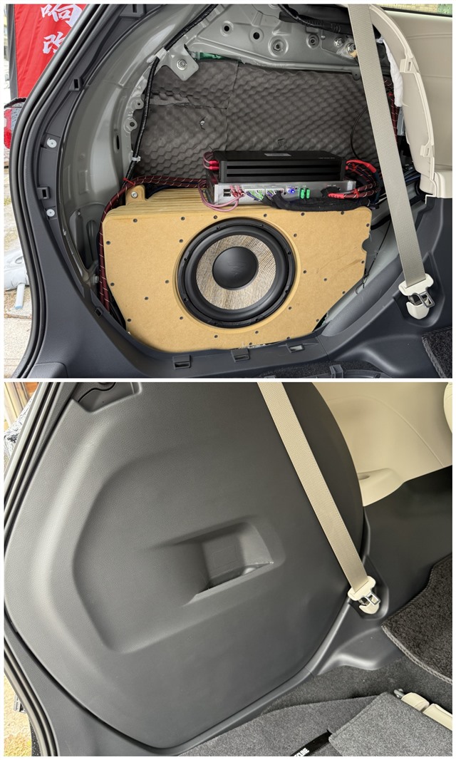 勁浪P25FE亞麻盆低音運用3D打印技術(shù)安裝在后箱左側(cè),上放置兩臺功放,不影響尾箱空間
