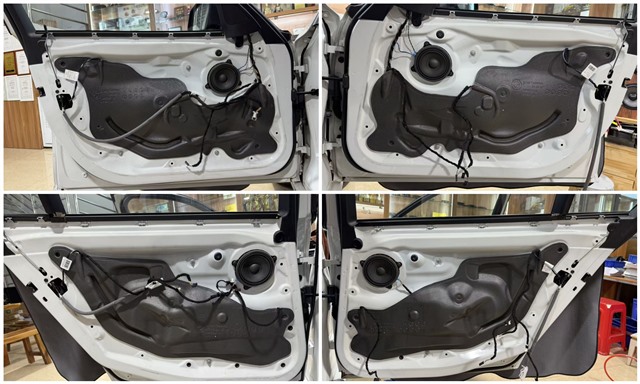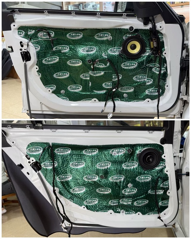門板進行徹底清潔后,隔音處理采用了雙層隔音工藝,內(nèi)層貼附抑制鈑金共振,外層密封形成箱體。這不僅大幅降低了風(fēng)噪和路噪,更讓每個車門都變成了一個扎實的“音箱”,極大提升了中低頻的響應(yīng)和純度,為喇叭提供一個理想的工作環(huán)境。