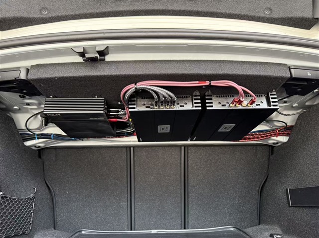 兩臺FRED FS-4功放和FP-8A處理器經(jīng)過精心設(shè)計,整齊地固定安置在后備箱車頂部,極其節(jié)省空間且便于調(diào)試,保持了車輛的實用性與美觀。
