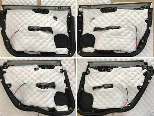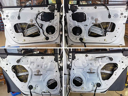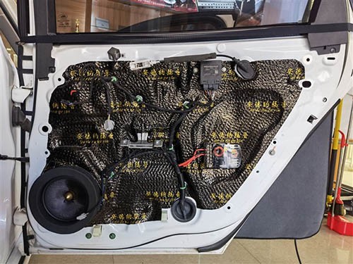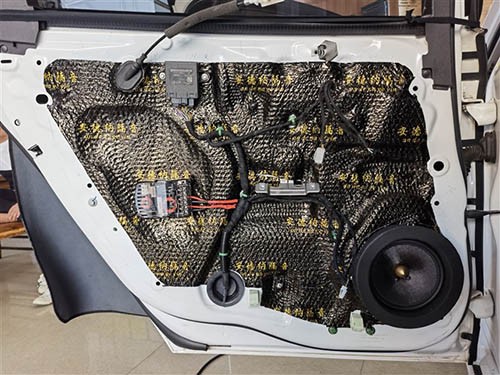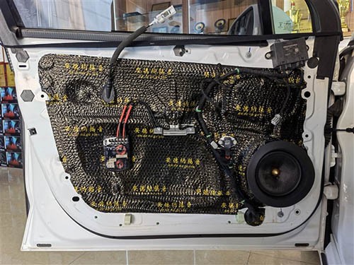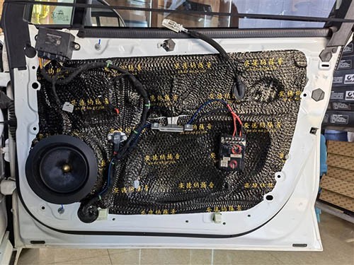 原車門板隔音措施較為簡單,風噪很容易通過門板傳入到車廂內(nèi)部。因此改裝技師使用安德納+吸音棉,對門板及飾蓋做了三層的隔音處理。這就像是為聲場喇叭制作了一個密封的箱體一般,有效阻止了風噪的傳入,為聲場喇叭創(chuàng)造了一個良好的工作環(huán)境。