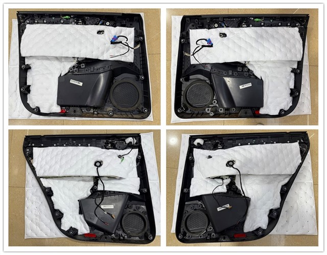 我們使用GT環(huán)保型減震材料為四門進(jìn)行三層專業(yè)隔音處理,大幅提升門板密封性與剛性,同時(shí)增強(qiáng)喇叭的聲壓響應(yīng)。第一層減震層,有效抑制共振。第二層封閉空腔,打造“箱體”效果。門板飾蓋填充高密度吸音棉,進(jìn)一步吸收中高頻噪音。前后聲場(chǎng)都升級(jí)法國(guó)勁浪ASE165兩分頻,這套喇叭在聲音表現(xiàn)和性價(jià)比之間取得了非常好的平衡。