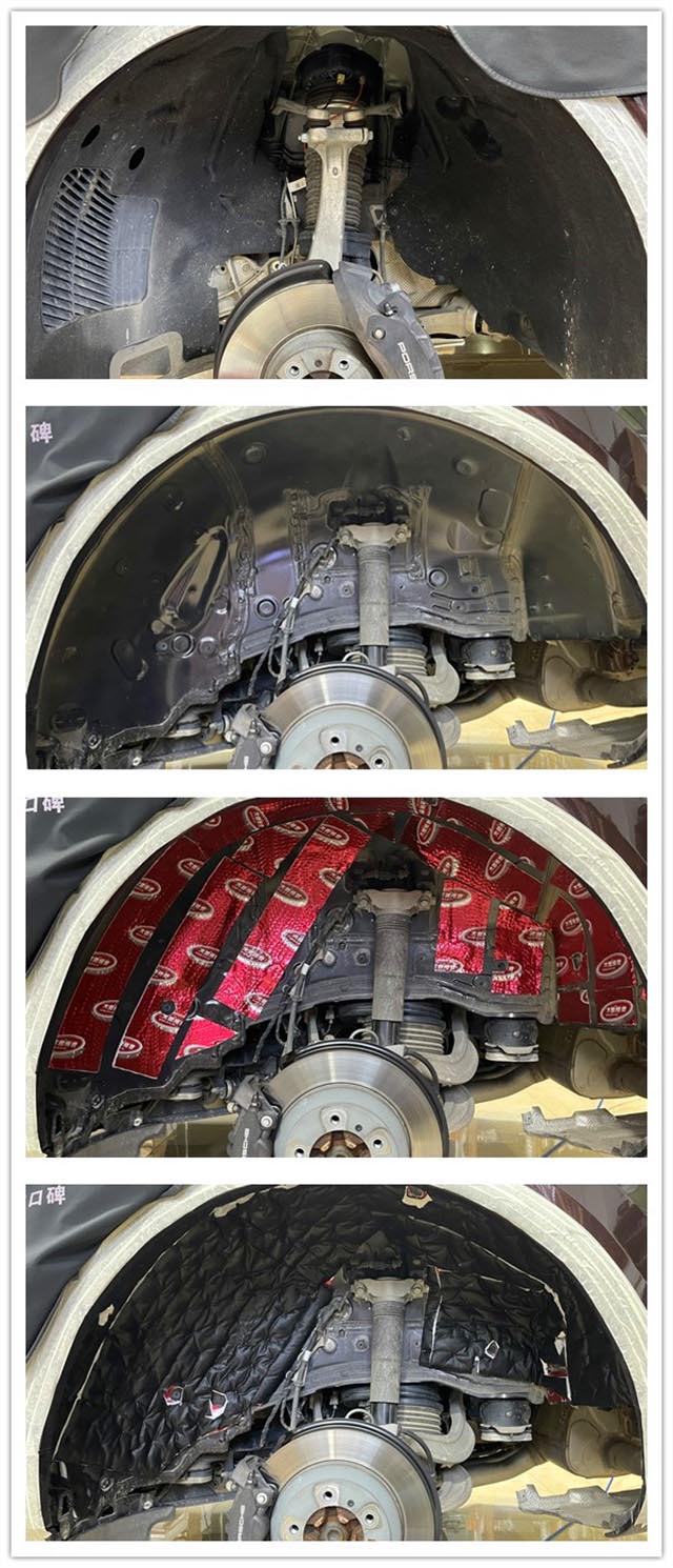 輪弧部分同樣不可忽視,這里既是胎噪的主要傳播通道,也是排氣管噪音的重要入口。為此,改裝師匠心獨運,選用大能紅派、噪音終結(jié)者以及超級溫莎三種隔音材料層層疊加,成功大幅削減了傳入車廂的胎噪,顯著減少了排氣管燥熱噪音,讓輪胎的聲音留在車外的世界。