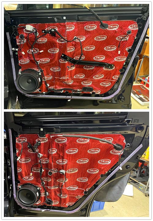 隔音改裝的關(guān)鍵在于選擇合適的隔音材料。在此次改裝中,改裝師選擇了大能隔音品牌對四門進行隔音處理。第一層采用大能紅派,具有優(yōu)異的減震、隔熱、防銹以及鈑金強化性能,第二層施工則進一步提升了隔音效果,第三層配備了超級溫莎棉,有效吸收共鳴噪音,阻隔熱能,同時降低能耗。