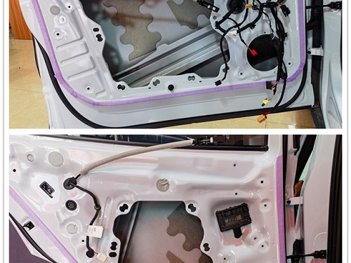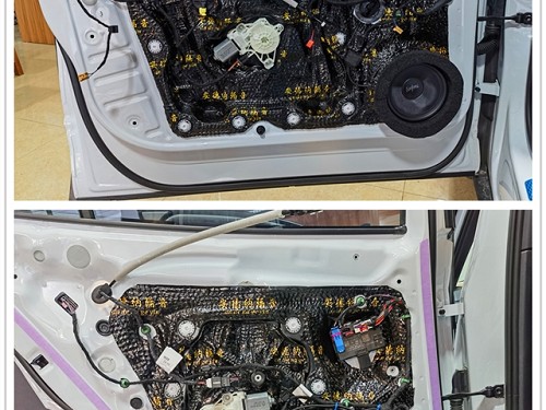 沒(méi)有良好靜謐的隔音環(huán)境,會(huì)影響音響器材還原的聲音清晰度,因此在改裝喇叭之前,改裝師使用安德納隔音材料對(duì)門(mén)板進(jìn)行雙層隔音處理,加強(qiáng)鈑金剛性,減少風(fēng)噪的傳入,再使用吸音棉對(duì)拆下來(lái)的門(mén)板飾蓋進(jìn)行填充。一共三層隔音處理,大大增強(qiáng)門(mén)板的隔音效果。