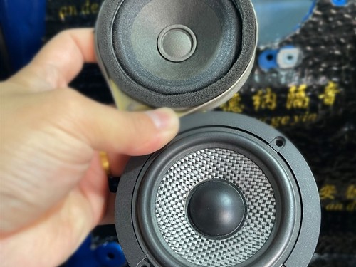 拆下來的原車中低音(上)與勁浪165AS3中低音(下)比較,可見原車?yán)扔昧陷^差,勁浪165AS3中低音音盆采用雙玻璃纖維制成,音色溫暖潤人