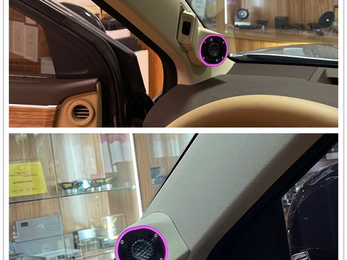 勁浪烏托邦高音喇叭倒模安裝在A柱的整體效果,加上氛圍燈的點(diǎn)綴,車(chē)內(nèi)氛圍感立即拉滿!
