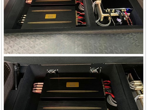 兩臺(tái)弗萊德FX-4功放及一臺(tái)歌航R316DSP處理器隱藏安裝在尾箱的凹槽位置