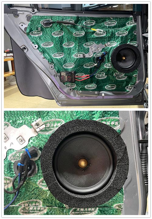 前門板使用大能頭等艙進(jìn)行隔音后,原位無損安裝勁浪PS165 SF板巖中低音喇叭,并為喇叭加裝專業(yè)美音圈