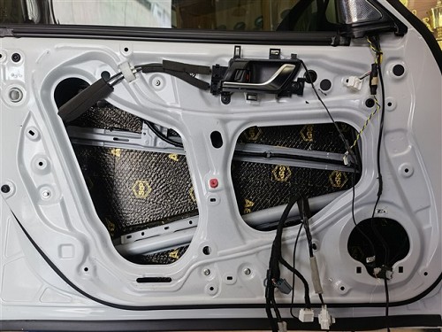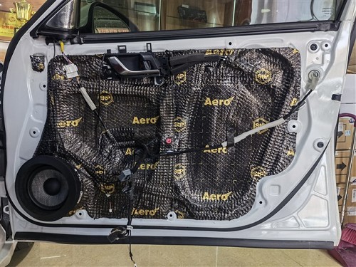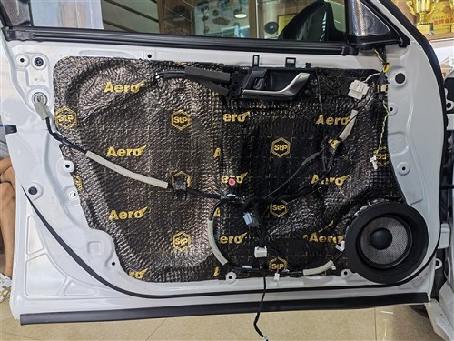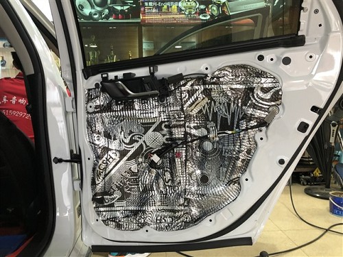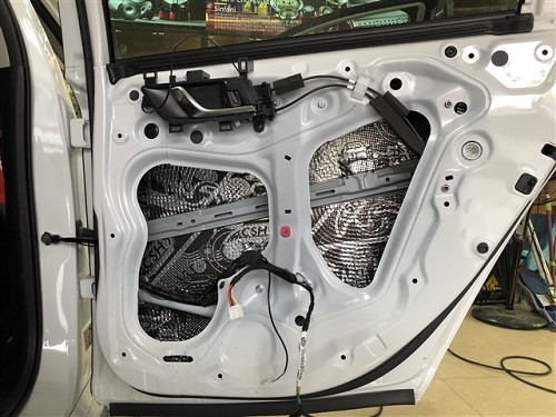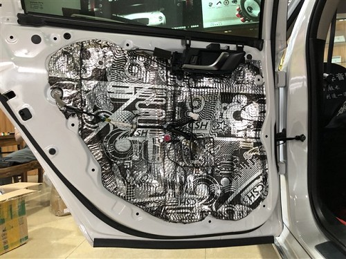 四門隔音對(duì)于聲場(chǎng)喇叭的音質(zhì)是有提升的,隔音后將門板形成一個(gè)密閉的箱體,提升音質(zhì),再者還可降低風(fēng)噪。針對(duì)噪音特點(diǎn),改裝師前門使用俄羅斯StP航空炸彈,后門使用俄羅斯StP小炸彈,將隔音材料緊密貼合鈑金,使得隔音效果達(dá)到最佳。