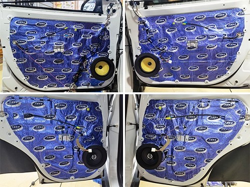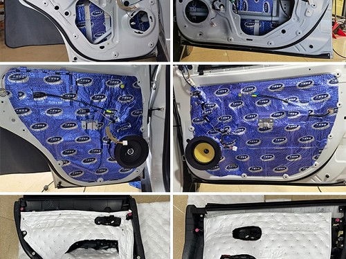 為了獲得更好的音質(zhì)效果,門板隔音很有必要。將門板鈑金清理干凈后,改裝技師使用大能藍(lán)金剛+吸音棉對門板做了三層隔音處理,提高門板鈑金的剛性,減少門板共振噪音,減少路噪、風(fēng)噪“入侵”的同時,將門板打造成一個密閉箱體,為聲場喇叭創(chuàng)造一個良好的工作環(huán)境。