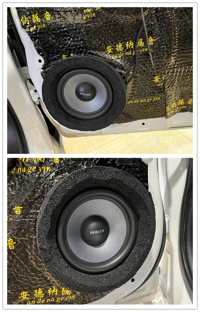 原車門板隔音措施極為欠缺,汽車行駛產(chǎn)生的風(fēng)噪會通過門板傳入車廂內(nèi)部,對音響品質(zhì)產(chǎn)生影響。因此改裝師使用安德納隔音材料對門板做了雙層隔音處理,這相當(dāng)于為聲場喇叭制作了一個(gè)箱體,讓喇叭發(fā)聲更加出色。