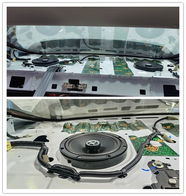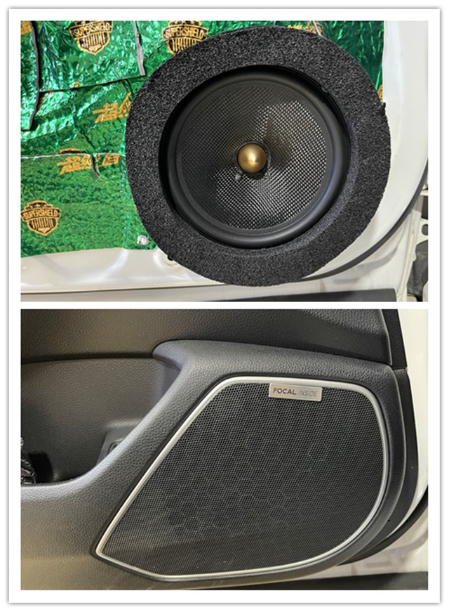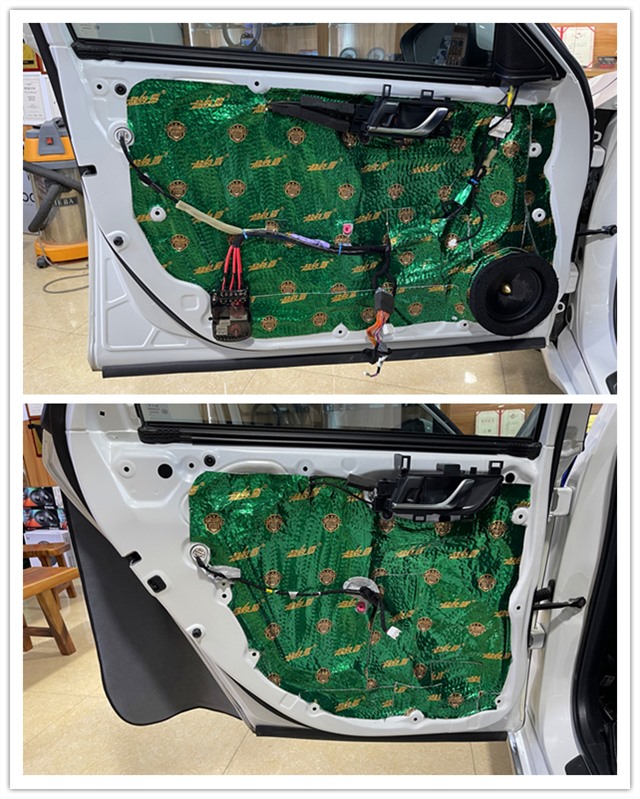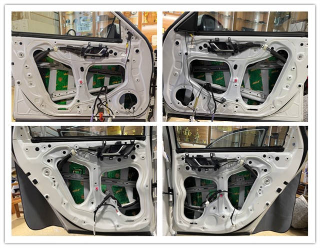由圖可見,原車門板內(nèi)部只有一層簡(jiǎn)單塑料薄膜,最多能防水浸入里面,很難起到良好的隔音效果。在改裝音響前,必須對(duì)車門做隔音,這是大家都應(yīng)該知道的了!我們改裝師將原車塑膠材料清除后,使用大能超級(jí)盾隔音材料對(duì)門板做雙層隔音處理,有效減少門板自身振動(dòng)噪聲以及風(fēng)噪對(duì)音響品質(zhì)的干擾,為聲場(chǎng)喇叭創(chuàng)造一個(gè)良好工作環(huán)境。