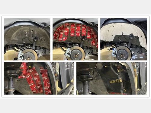 由于汽車行駛時會產(chǎn)生較大的路噪和胎噪,此類噪聲主要通過輪弧傳入到車廂內(nèi)部,所以改裝師在使用大能紅派對輪弧做了止振處理之后,又使用噪音終結(jié)者對輪弧做了隔音處理,從而將路噪和胎噪阻隔在了車廂之外。