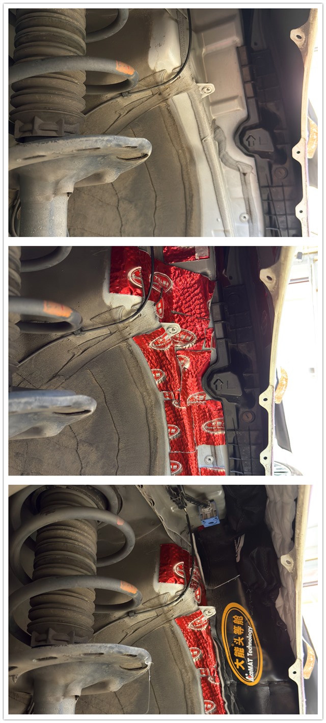 汽車在高速行駛或經過路面粗糙時,胎噪更為明顯。為有效降低胎噪,改裝師在四個輪弧內側貼合了大能隔音材料。可以增強輪弧結構的剛性,從而有效抑制共振和滾動噪音的傳入。在安裝過程中,根據每個輪腔的曲面結構,精細裁剪并彎折材料,使其嚴密貼合鈑金表面,確保無空鼓、無翹邊,最大限度發(fā)揮材料的隔音減震效果。
