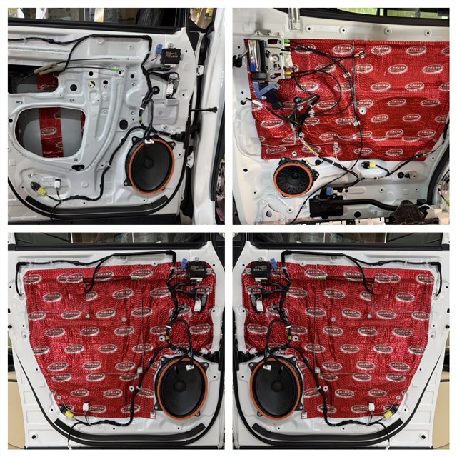 阿爾法原車門板內(nèi)部僅有一層簡單的塑料防水膜,無法起到隔音作用。我們將其徹底清除,首先在內(nèi)層鈑金緊貼一層 大能紅派,有效抑制車門共振。隨后,在外層再密封一層 紅派,形成一個(gè)扎實(shí)的箱體結(jié)構(gòu)。這不僅大幅降低了風(fēng)噪和外界環(huán)境音的傳入,更能讓車門變得更加厚實(shí),關(guān)門聲更加沉穩(wěn)。最后,在門板飾蓋上粘貼 超級溫莎,進(jìn)一步吸收殘余噪音,并為音響系統(tǒng)提供一個(gè)更佳的工作環(huán)境。