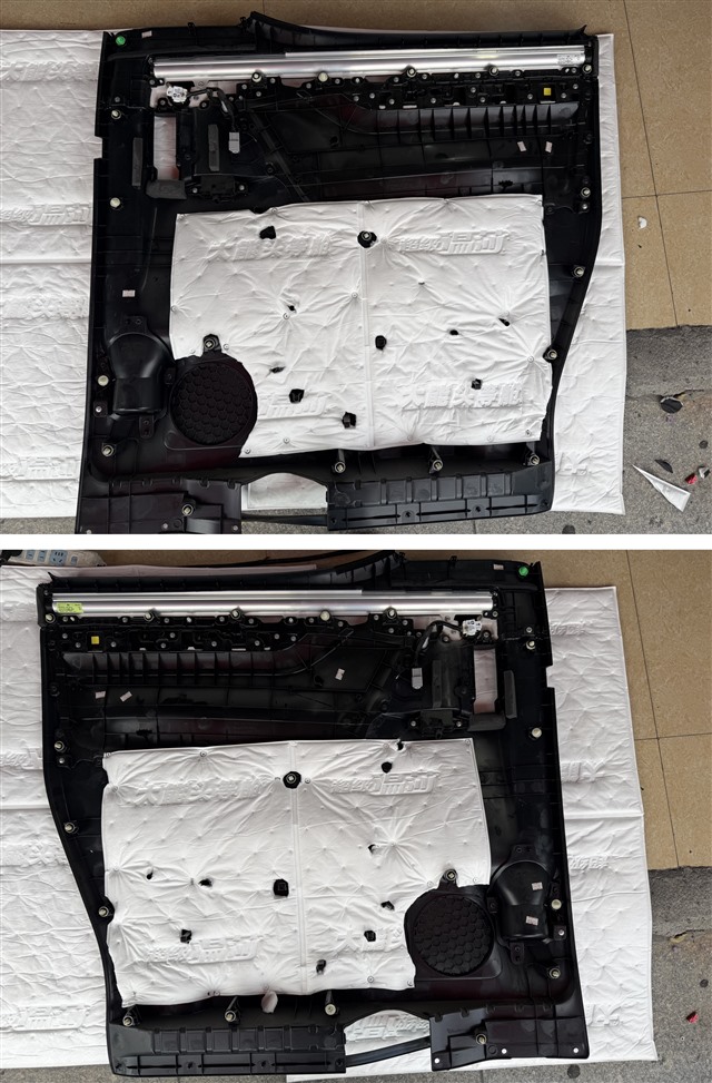 原車門板內(nèi)部結(jié)構(gòu)簡陋,只是一層薄塑膠紙,起不到隔音作用