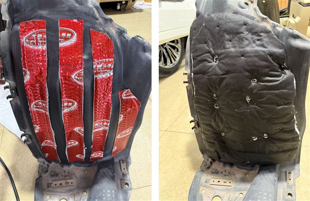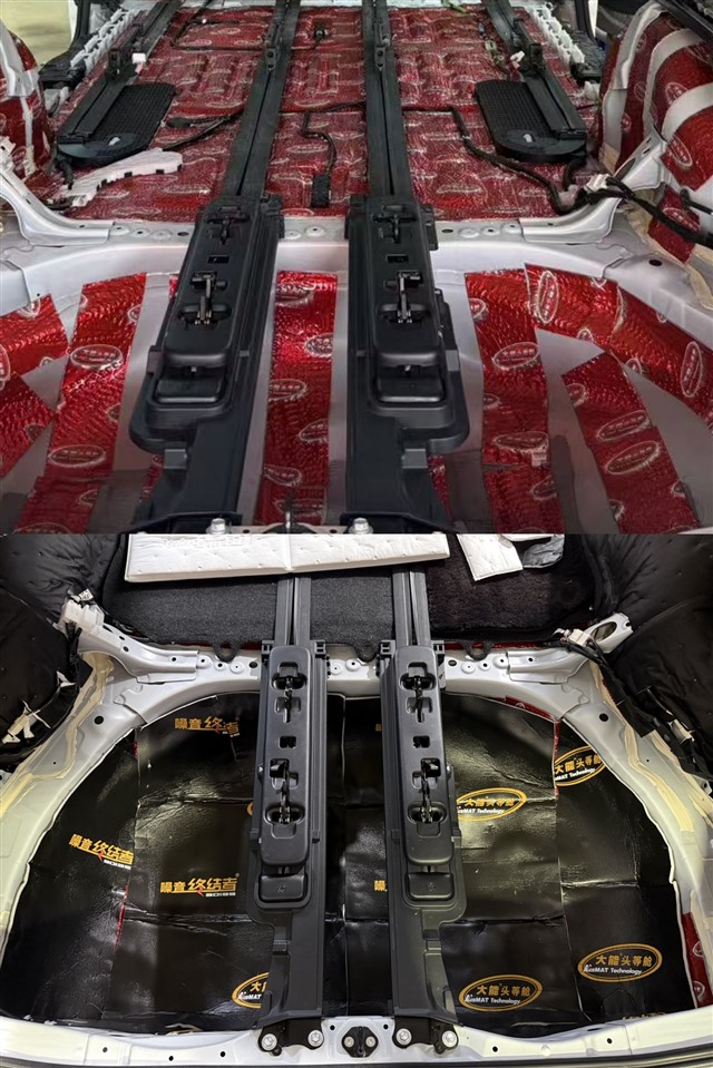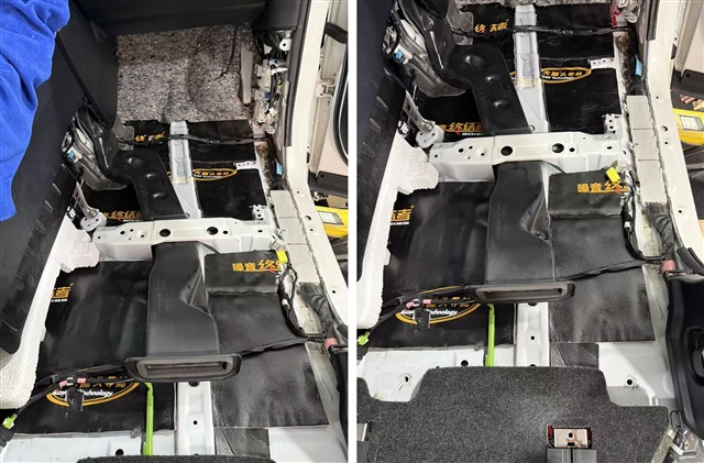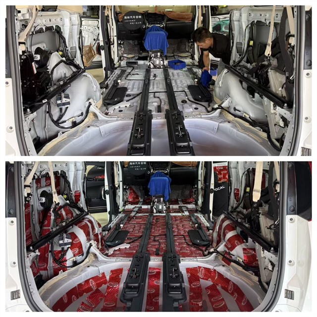 底盤是路噪和低頻共振的主要來源。我們將座椅、地毯等全部拆開,對裸露的鈑金進(jìn)行徹底清潔。首先滿鋪 大能紅派 止振板,牢牢抑制住底盤的振動。隨后,在止振層之上再覆蓋一層 噪音終結(jié)者 吸音棉,將傳導(dǎo)至車內(nèi)的中高頻路噪和輪胎噪音層層吸收、過濾。特別是駕駛員和乘客的 前腳踏 區(qū)域,這里是前輪噪傳入的主要路徑,我們同樣采用了 紅派+噪音終結(jié)者 的雙層處理,從源頭上阻隔煩人的路噪。