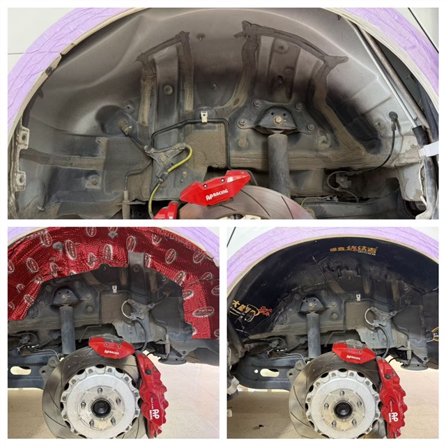 輪胎與地面摩擦產(chǎn)生的噪音,主要通過輪弧和翼子板傳入車廂。我們針對 四輪翼子板 這個(gè)重點(diǎn)部位,進(jìn)行了三重隔音處理:先在鈑金上粘貼 大能紅派 止振,再填充 噪音終結(jié)者 吸收雜音,最后在輪弧襯板內(nèi)側(cè)加貼 超級溫莎,形成一道立體化的防線,讓最為惱人的胎噪“銷聲匿跡”。