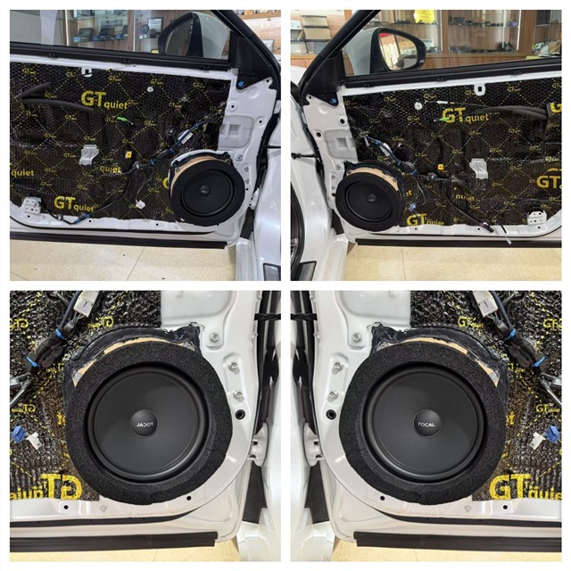 前門選用勁浪 ISU200 兩分頻喇叭,作為勁浪旗下的經(jīng)典型號,其精準(zhǔn)的聲音還原能力備受認(rèn)可。高音單元安裝在儀表臺兩側(cè)原位,確保聲場高度與指向性,讓高音清晰通透、穿透力十足;中低音單元則適配前門板原位安裝,在做GT雙層隔音之下,中低音更呈現(xiàn)出飽滿渾厚的中低頻質(zhì)感。