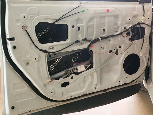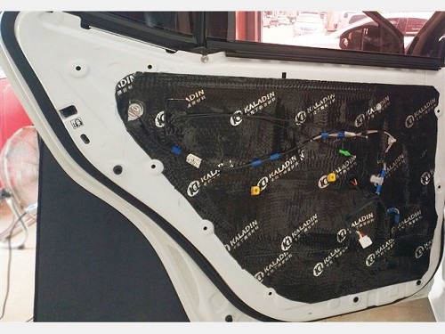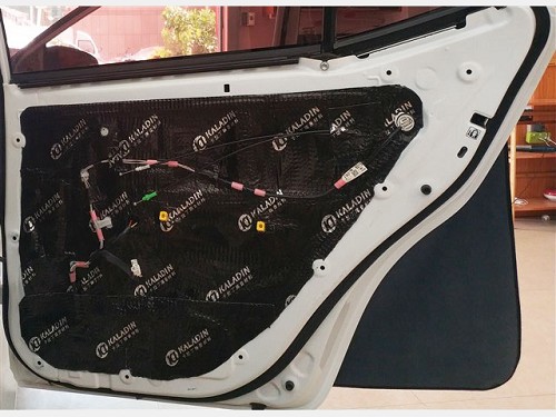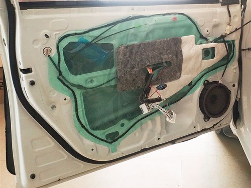 首先使用卡拉丁對車門進行隔音處理,提升門板剛性,減少噪音入侵,將門板打造成一個密封的箱體,提升喇叭的音質(zhì)效果。